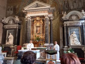La prima tappa in San Giovanni in Laterano, storica basilica papale del IV secolo, ha segnato il primo momento significativo del nostro pellegrinaggio con la visita al Battistero. Noi tutti insieme, 65 persone, ci siamo disposti in cerchio intorno alla bella balaustra in marmo, ammirati dalla bellezza della cupola e del colonnato; lì abbiamo fatto il rinnovo delle promesse battesimali e don Gian Carlo ci ha aspersi con l’acqua, segno di purificazione e rinnovamento. Il momento successivo, centro della giornata, si è svolto nell’antica cappella a fianco, dove abbiamo avuto la possibilità di celebrare la S. Messa, solo noi, anche qui in un contesto di bellissimi mosaici e pavimentazioni antichissimi. Ci siamo poi diretti verso l’interno della basilica lateranense dove, prima di varcare la Porta Santa, abbiamo fatto un momento di preghiera e la professione di fede con la recita del Credo. Dell’interno della basilica abbiamo purtroppo visto poco poiché vi era una celebrazione eucaristica in corso…. e così ci è rimasta la curiosità di vedere, tra l’altro, l’abside e l’affresco, di cui ci ha parlato don Gian Carlo, raffigurante Papa Bonifacio VIII che impartisce la benedizione e proclama il primo giubileo (un buon motivo per tornare!).